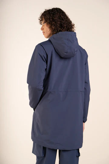 Donker blauw water en winddicht jas met kap, kan je centreren in taille.