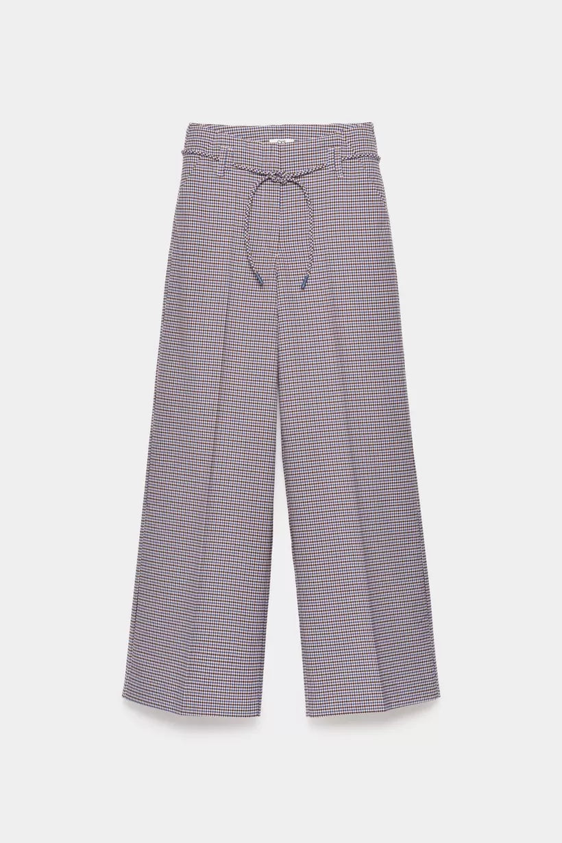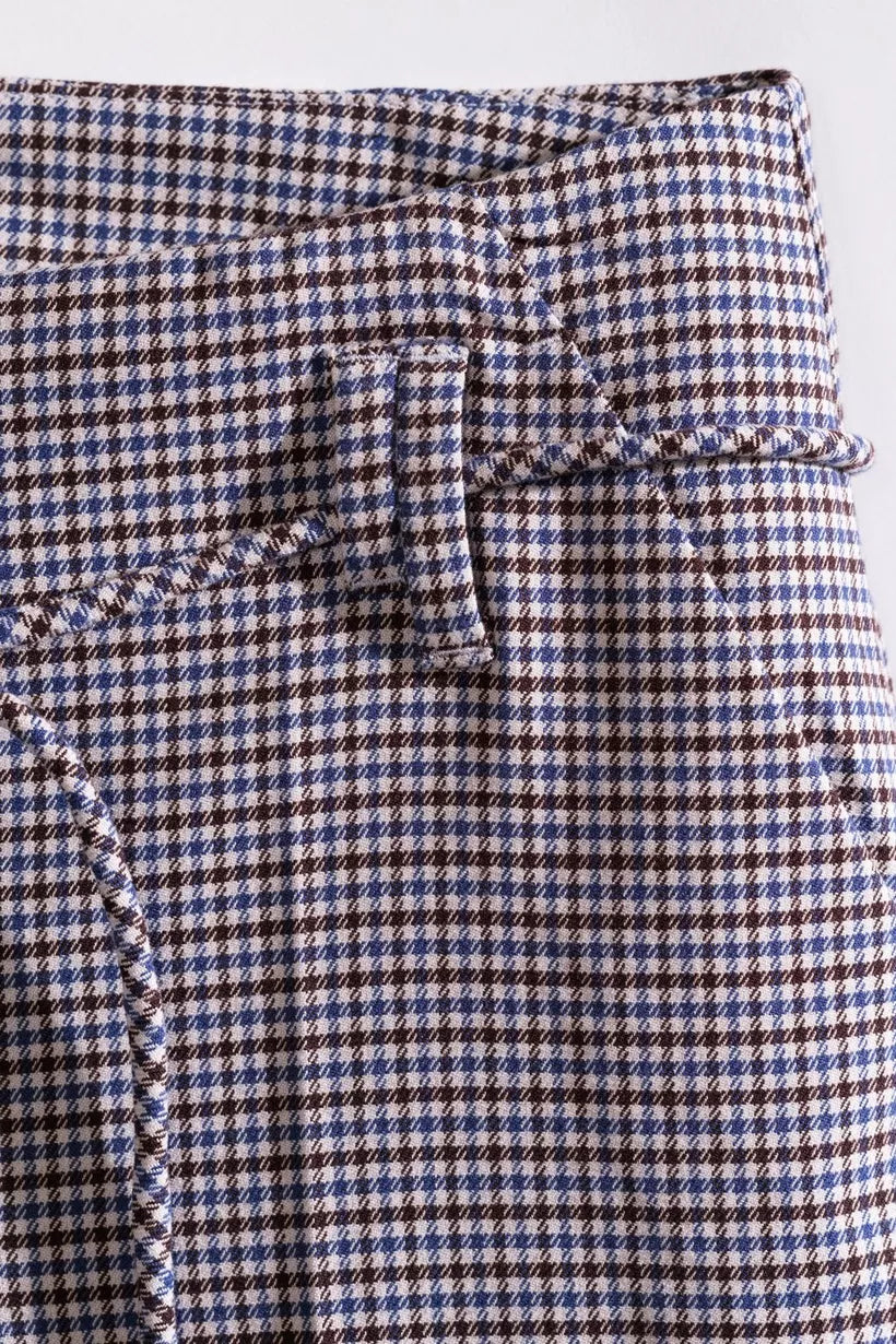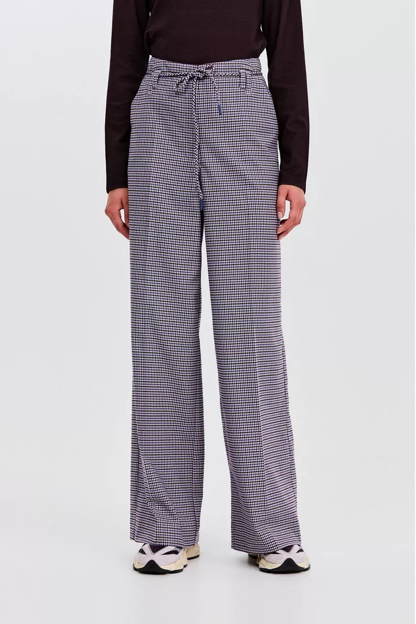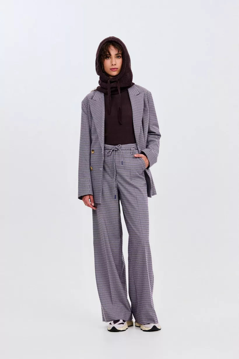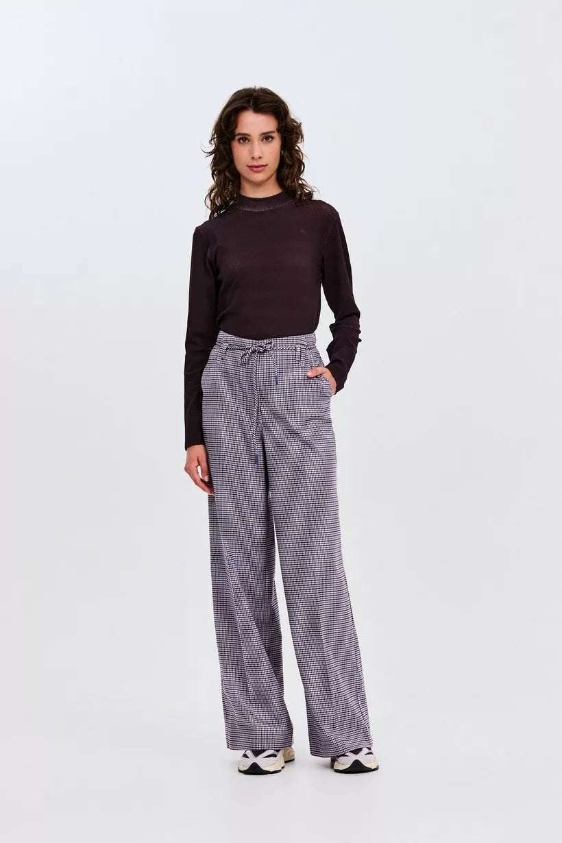 Van een dag op kantoor tot een lunch date in het weekend: deze lange, wijde damesbroek draag je de hele herfst en winter door. Deze bruinblauwe, geruite broek heeft een hoge taille, een plooi aan de voorzijde en riemlusjes met een touw als riem. Styling tip: draag hem als pak met de bijpassende blazer.