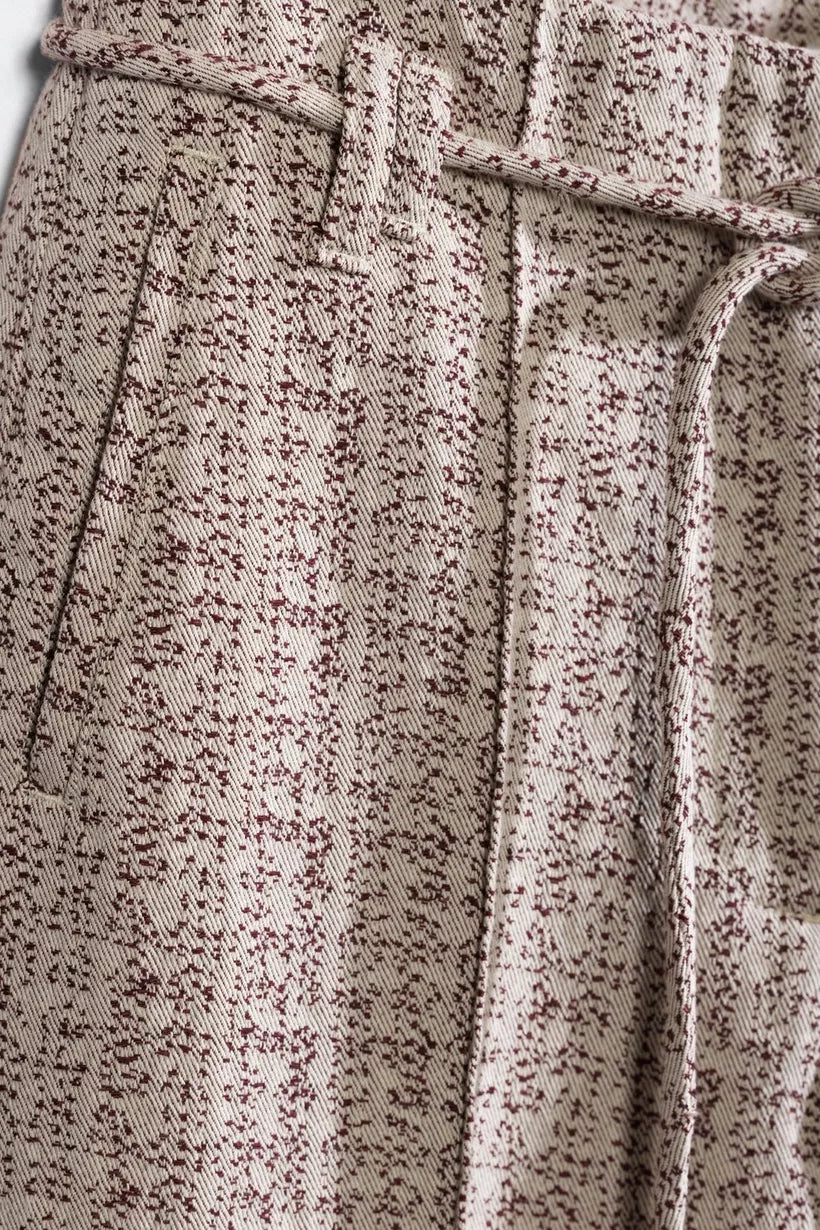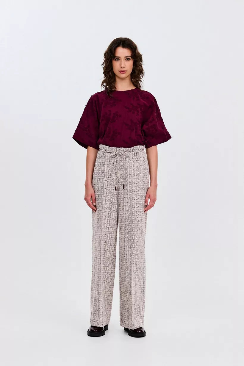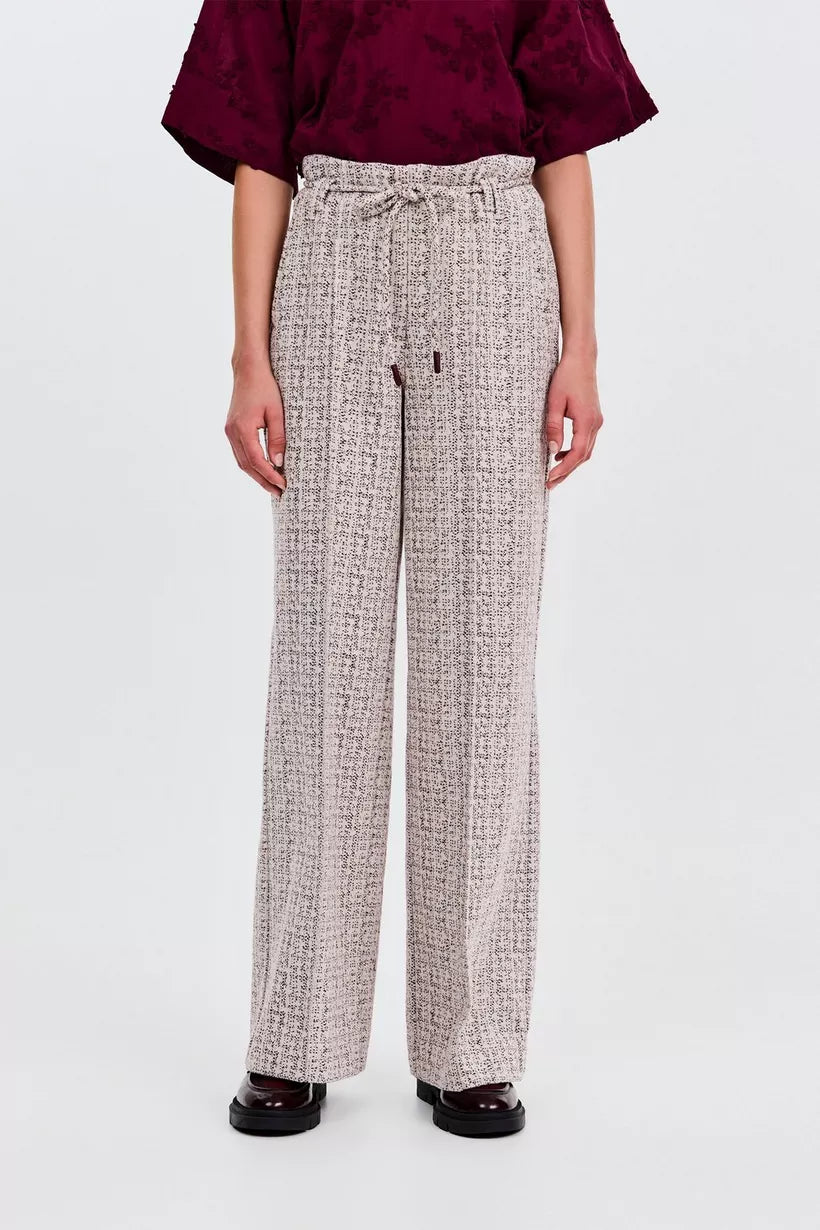 Omarm de herfst en winter met deze witgrijze, lange damesbroek met wijde broekspijpen, een hoge taille en een bijhorend touwtje als riem. Een speelse, gespikkelde textuur mixt bordeaux en paarse tinten