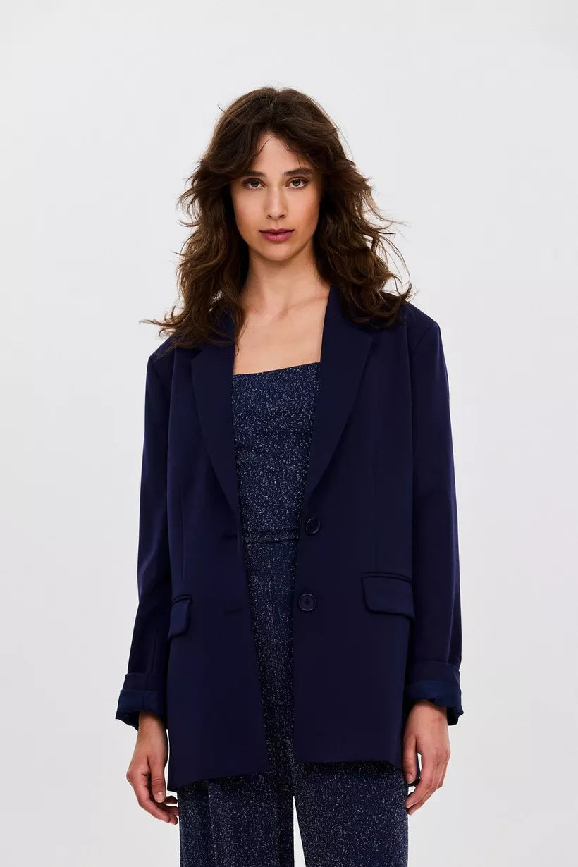 Blazers zijn al-tijd een winner, en deze donkerblauwe blazer met enkele knoopsluiting voor dames is een veelzijdig item dat niet in je garderobe mag ontbreken. Je kan hem stylen bij je party look, maar ook perfect naar kantoor of voor een koffie date dragen met een jeansbroek. Bevat o.a. 63% Recycled Polyester en 32% viscose.