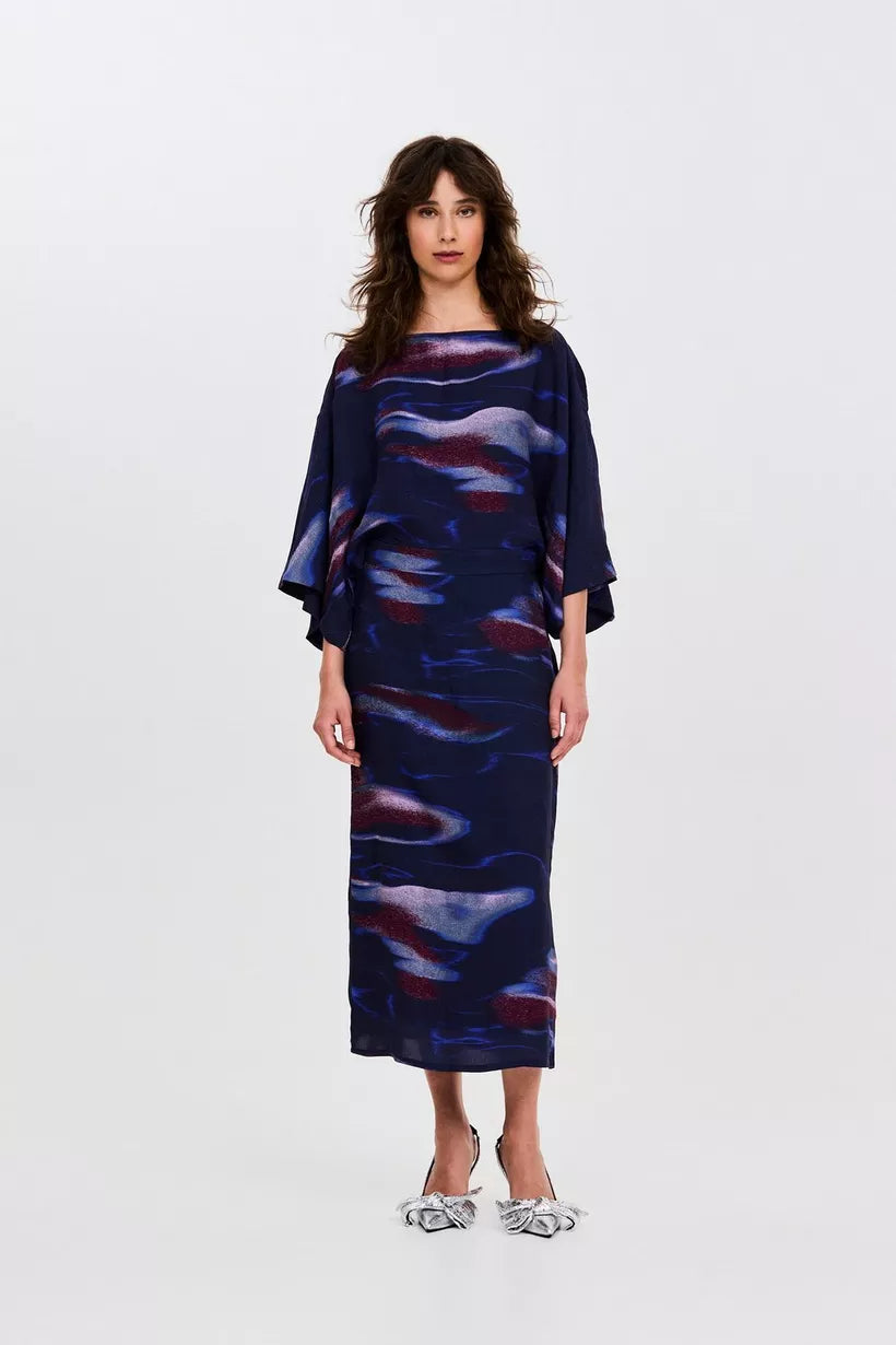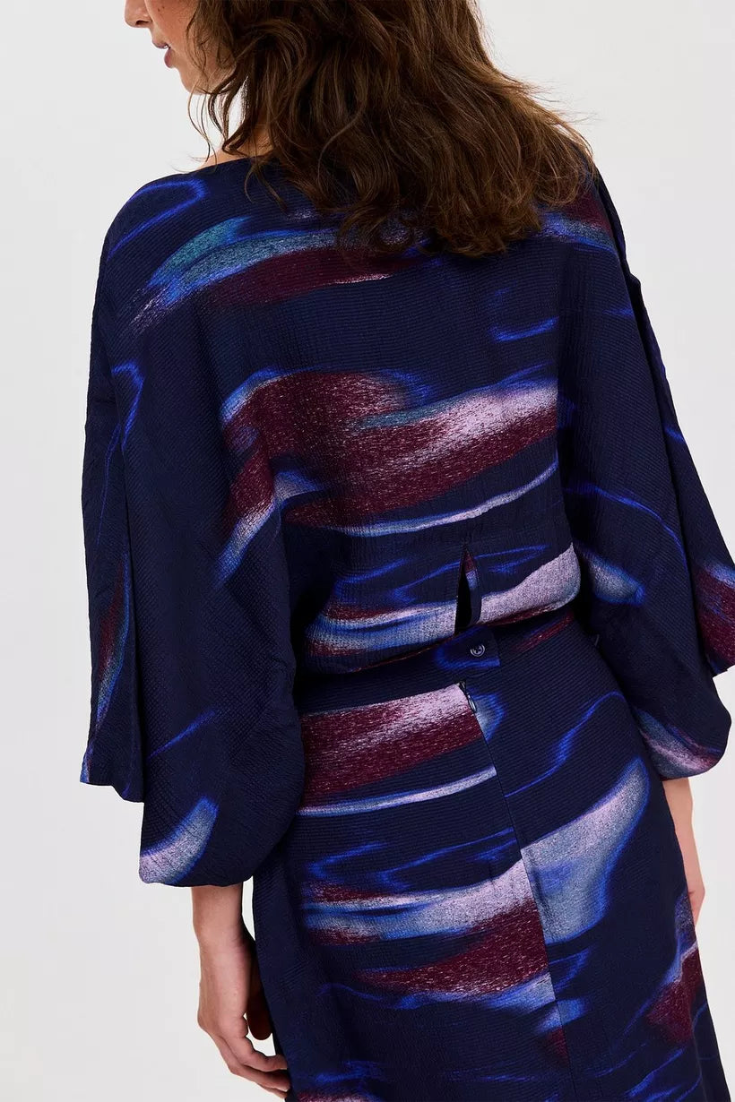 Let's get this party started! We stellen je voor aan de ultieme feestjurk! Deze donkerblauwe, lange damesjurk heeft volumineuze voor een fascinerend kimono-effect en een wordt tot leven gebracht met een abstracte print die bordeaux met blauw combineert. De rechte rok benadrukt dan weer jouw figuur op een gesofisticeerde manier.