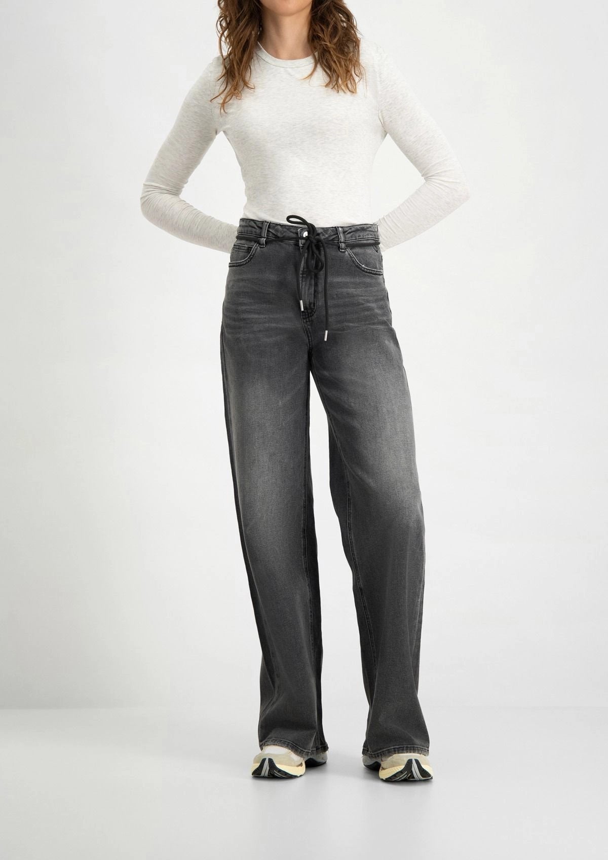 Dames jeans met een wide leg fit en een mid-rise, gemaakt van stretch denim. De Jona jeans heeft een 5-pocket design, is voorzien van een stoffen veter ceintuur en is uitgevoerd in een vintage grijze tint. Beschikbaar in meerdere wassingen.