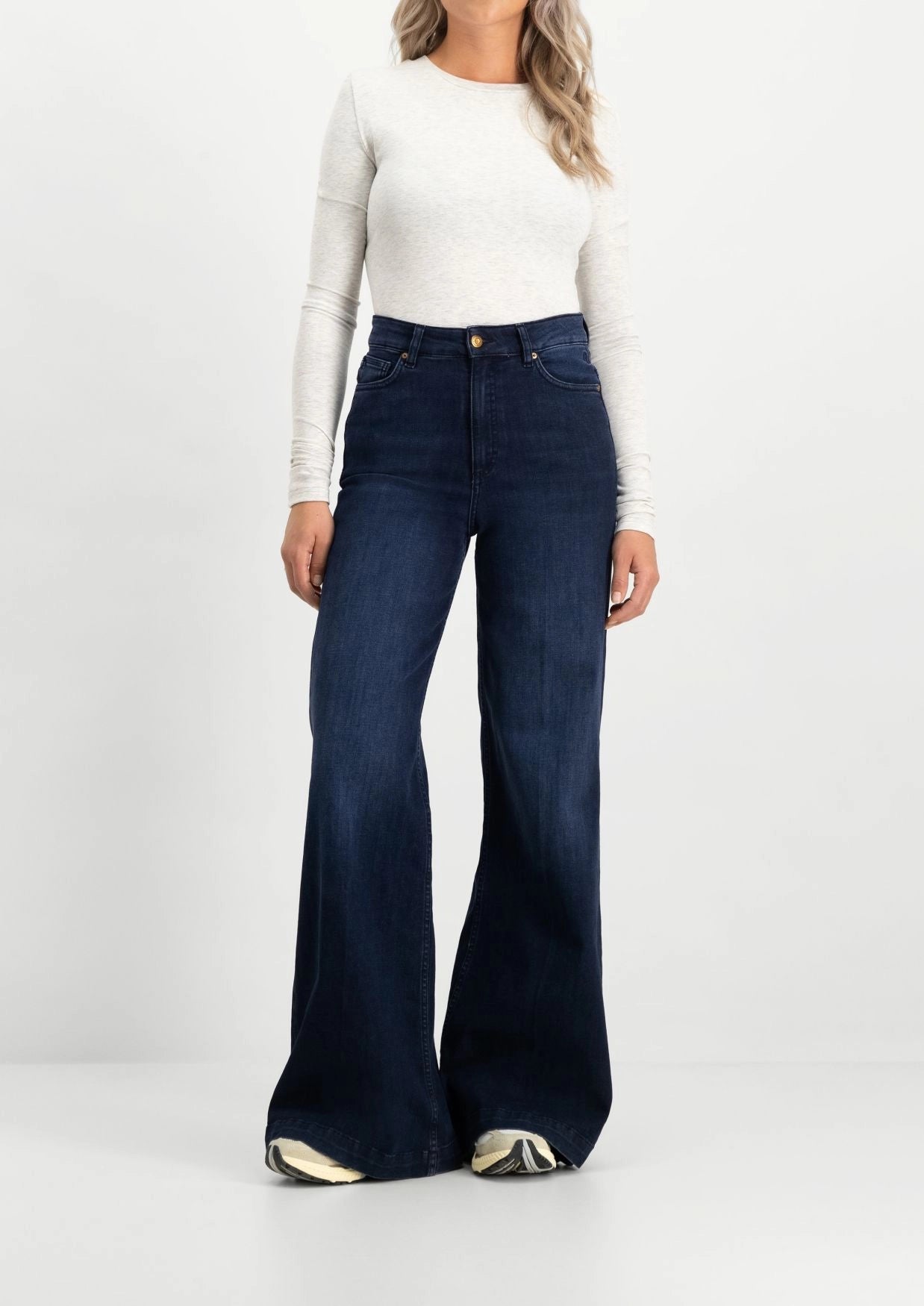 De Palmer is onze high-rise wide leg jeans en is gemaakt van zacht stretch denim. De broek heeft een aangesloten fit op de billen en onderrug en een brede zoom aan de onderkant en is uitgevoerd in het donkerblauw met een subtiele fade.