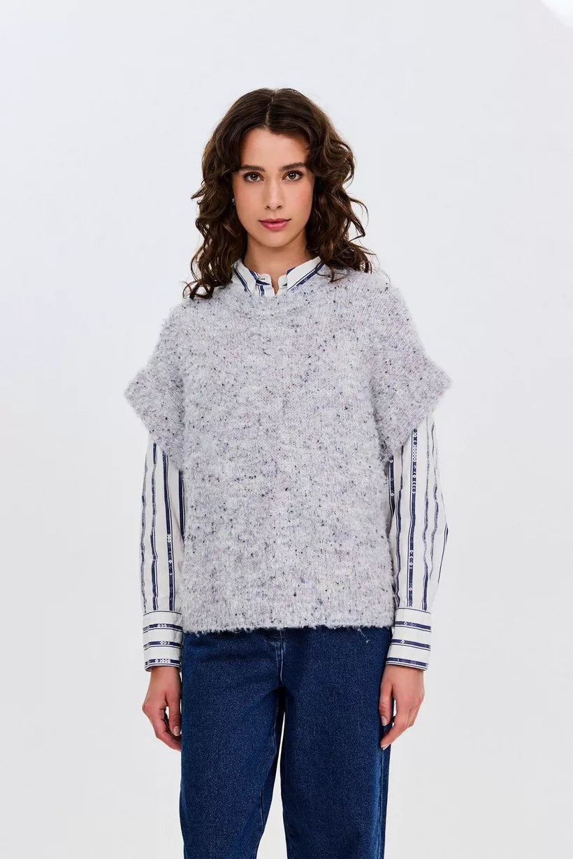 Over een hemd, een blouse of T-shirt: deze grijze, gebreide debardeur voor dames style je voor elke gelegenheid. Dit gebreide item is voorzien van een speelse spikkel en korte wijde mouwen voor een relaxte look.
