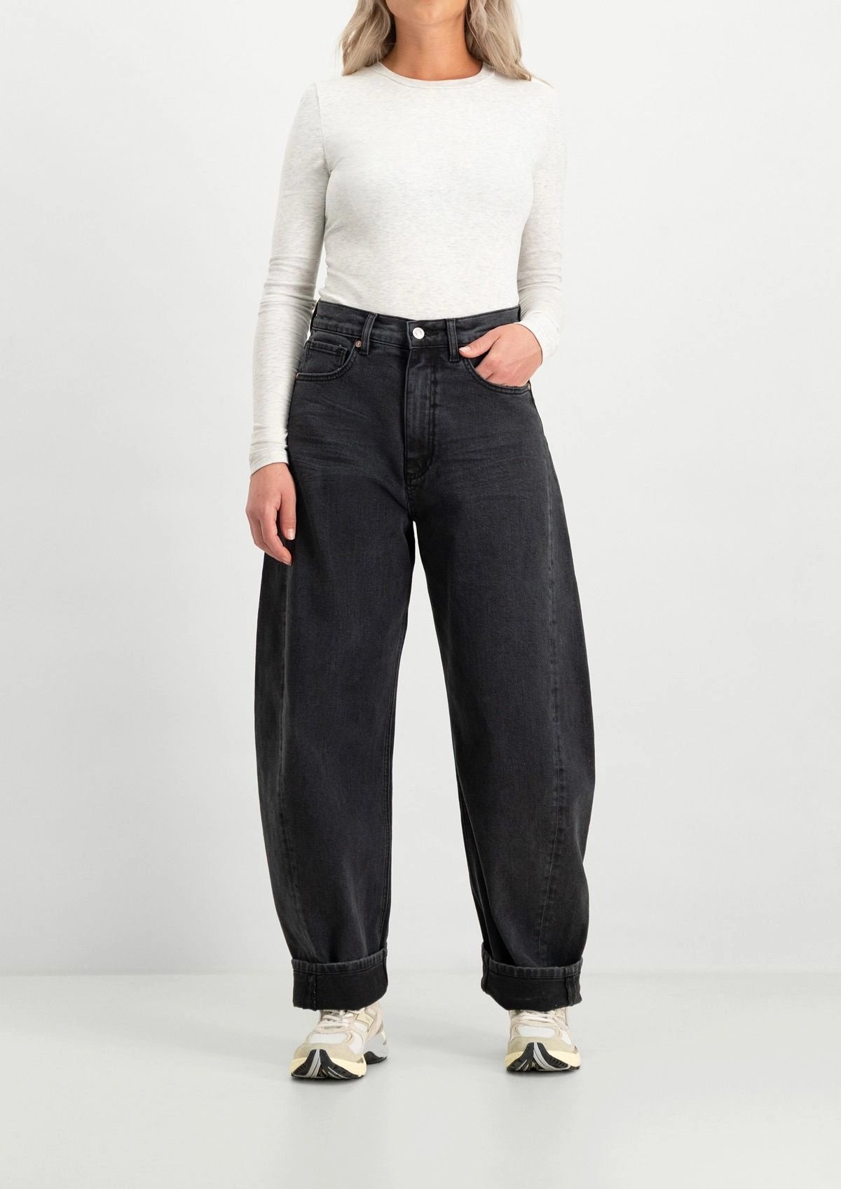 Wijdvallende dames jeans met een barrel fit en een hoge taille. De Robin denim is ontworpen met inzetstukken op de buitennaden en is uitgevoerd in het zwart met een lichte fade.
