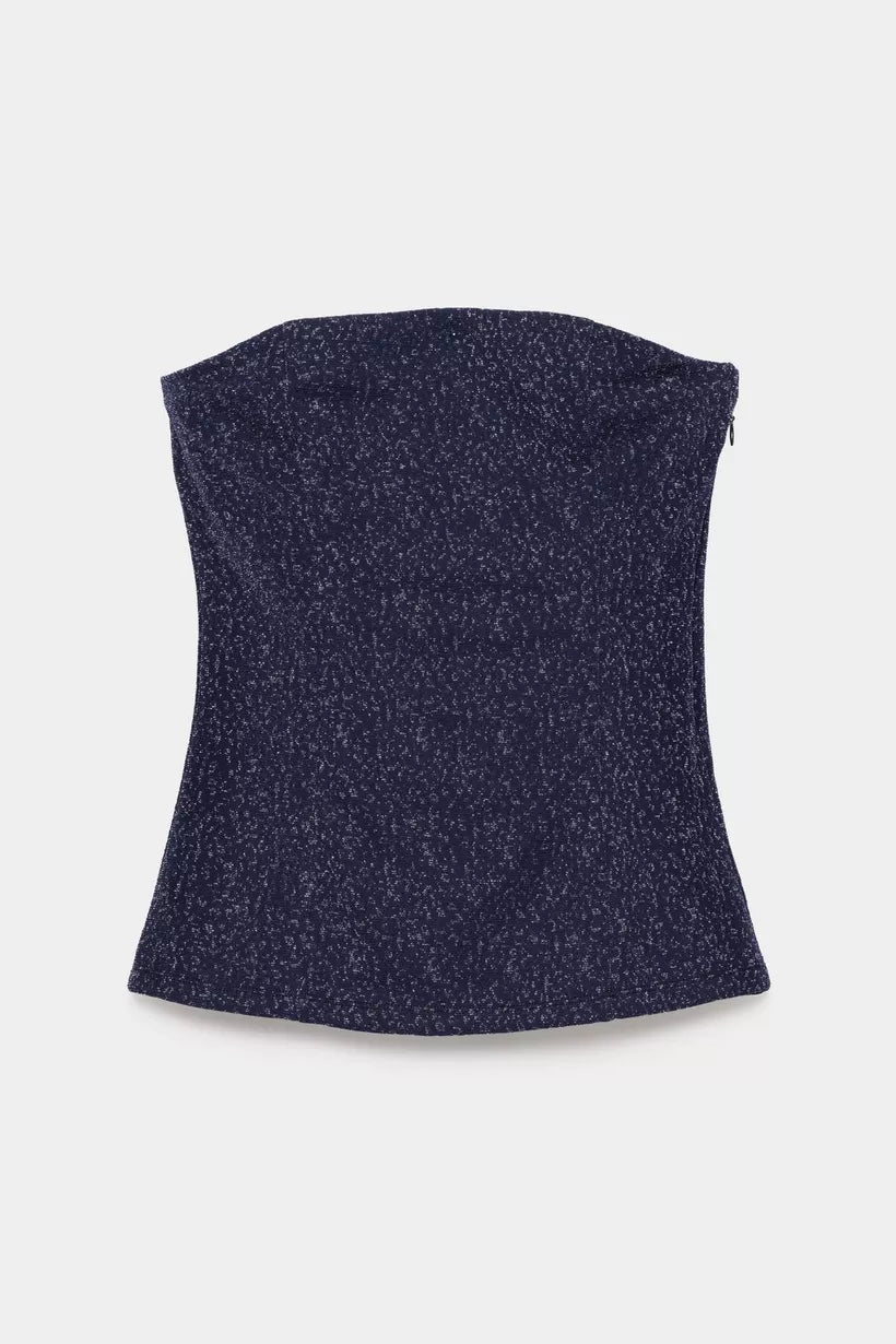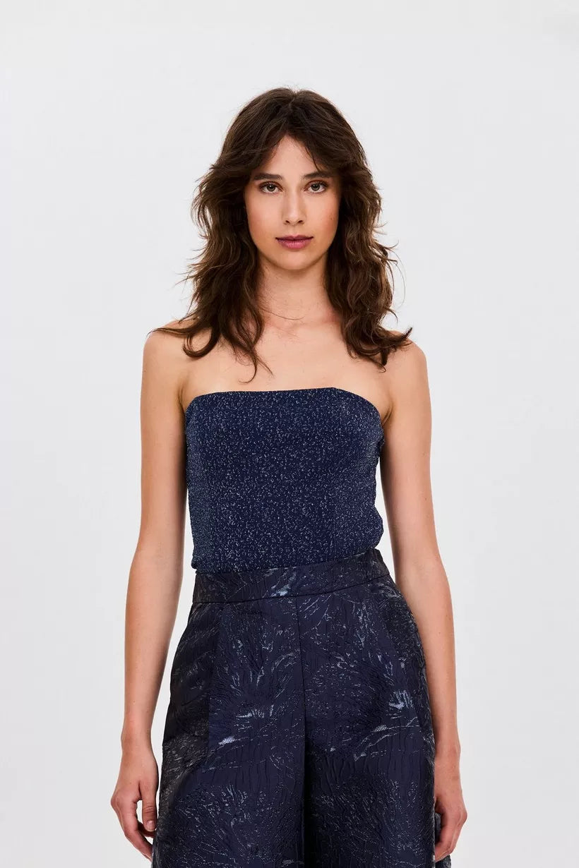 Op zoek naar het ultieme party item? Deze bustier top voor dames in glitters is het pronkstuk van jouw feestlook! Draag deze aansluitende, mouwloze top in combinatie met een blazer en wijde broek en maak zo op elke party een statement.