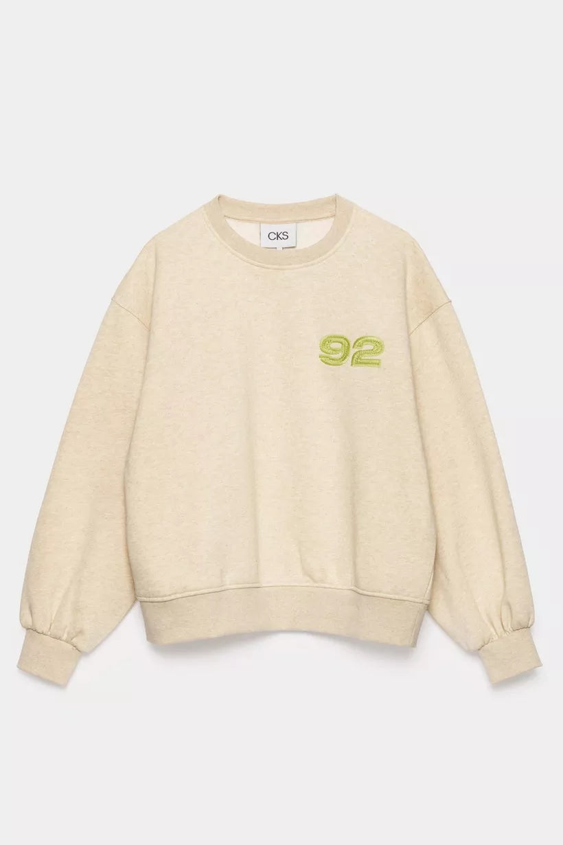 Deze ecru sweater voor dames is de perfecte mix van comfy en trendy. De relaxte fit, ronde hals en laag ingezette mouwen zorgen voor een effortless look. Het groene geborduurde detail geeft een sporty twist die instant opvalt. Combineer met jeans of een rok voor een casual look.