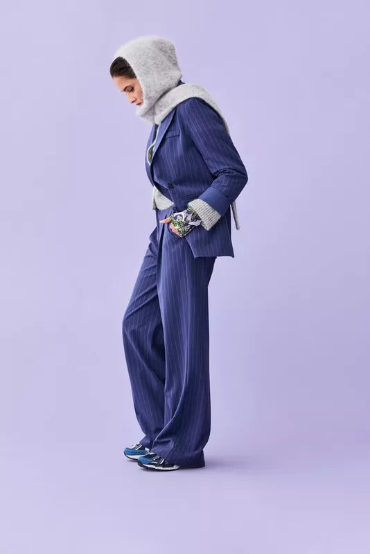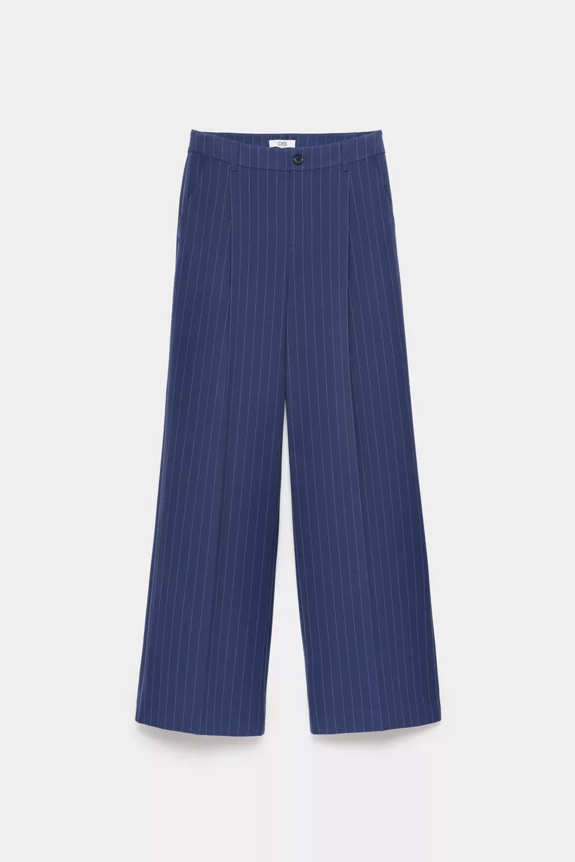 Wat de gelegenheid ook is: deze blauwe, geklede damesbroek in krijtstreepprint kan je zowel tijdens als na de office hours dragen. Dit item heeft een hoge taille met knoopsluiting, wijde broekspijpen en is voorzien van plooien voor een verfijnde look. Draag de broek als pak met de matching blazer.